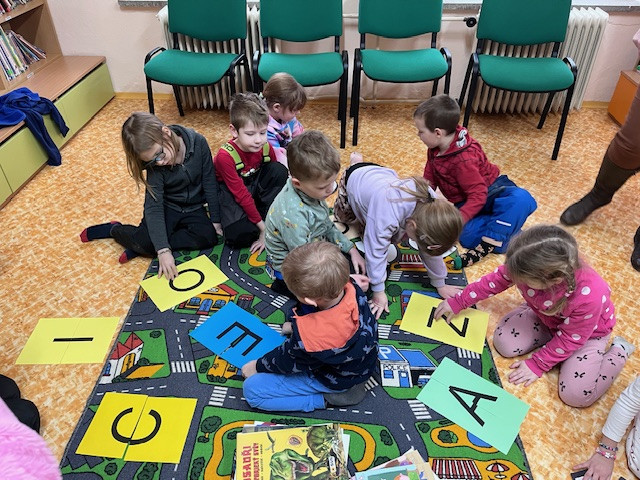 Potom plnily děti úkoly. Rozdala jsem jim kartičky s rozstříhanými písmenky a děti je skládaly dohromady a poznávaly písmenka. Na závěr prohlížení knížek a sladká odměna. Děti si s sebou odnesly do školky hromadu knížek ke čtení.