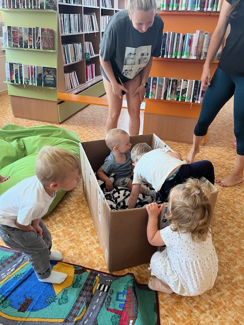 Děti si hrály s hračkami, prolézaly mezi regály, prohlížely knížky, některé si kreslily, zpívalo se a tancovalo, největším hitem ovšem byla velká krabice